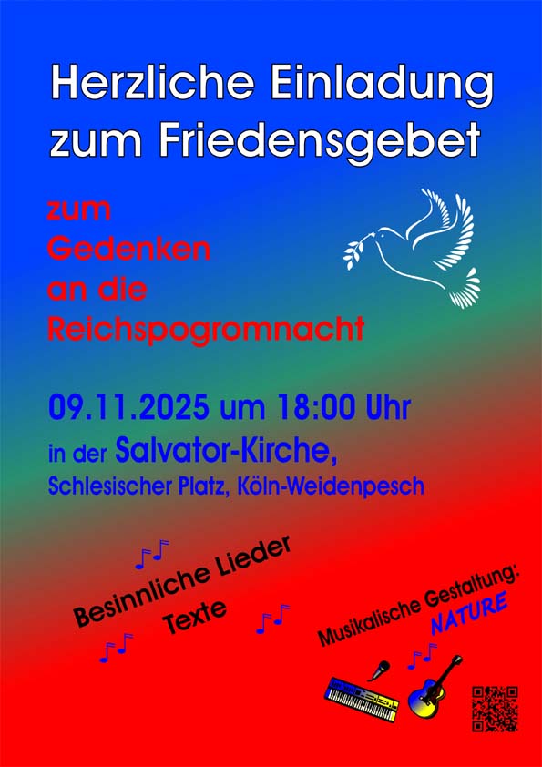 Sonntag, 09.11.2025, 18:00 Uhr: Friedensgebet zum Gedenken an die Reichpogramnacht in der Salvator-Kirche, Schlesischer Platz, Köln-Weidenpesch |